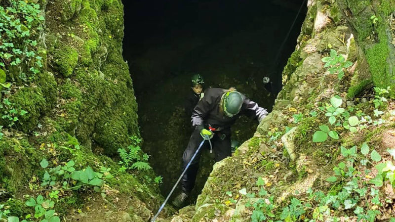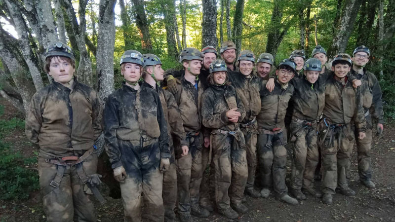 Absolute Dunkelheit, Kälte und jede Menge Schlamm: Was sich auf den ersten Blick unangenehm anhört, war für einige unserer Ranger ein tolles Abenteuer. Wir waren unterwegs auf Höhlentour in Frankreich. Los gings am Freitag von Erkrath aus mit einer langen Fahrt bis nach Freiburg, wo wir unser Basislager aufschlugen. Früh am nächsten Morgen ging es dann nach Bournois im französischen Département Doubs. Dort liegt versteckt am Ende eines Feldweges in einem kleinen Wäldchen die Grotte de la Malatière. Hinein kommt man nur durch einen sieben Meter tiefen Schacht. Gut ausgestattet mit Helm, Schlaz (Höhlenanzug), Stirnlampe und jeder Menge Klettermaterial, seilten wir uns auf den Grund der Höhle ab. Dort zeigte sich gleich, dass die Höhle durchaus ernst zu nehmen ist: Ein Haufen Knochen zeugte von den Tieren, die im Laufe der Zeit durch das Eingangsloch gestürzt waren.